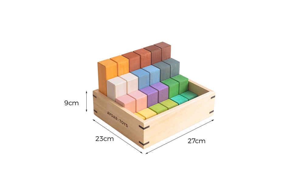 This 24-piece set features blocks in four different lengths, designed to introduce early math concepts through learning through play with visual and hands-on experiences. The varying sizes represent quantities in a colorful, tactile form, making counting and comparing engaging and intuitive. This set can be used on its own or combined with other toys like the Rainbow Stacker and building blocks.