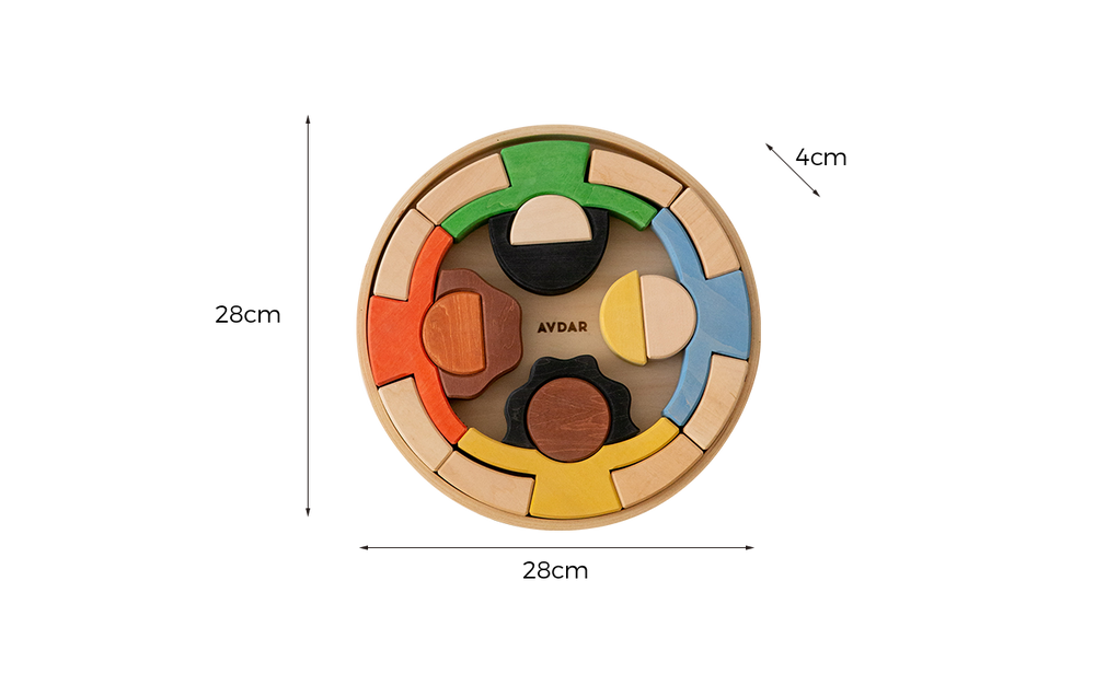 The AVDAR Joy Puzzle Block includes 12 carefully handcrafted pieces and a round tray for easy storage. This set is the winning design from the 2022 AVDAR Joy Design Event, created by Tija van Klaarbergen from the Netherlands. The inspiration behind this design is “Joy only exists when every kid feels included.”