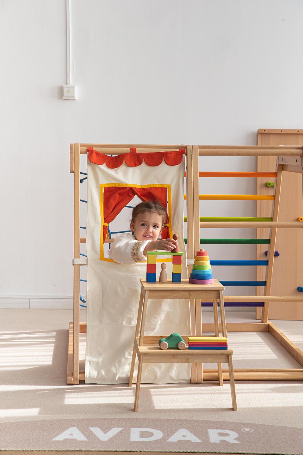 Designed to enhance pretend and imaginative play, the AVDAR Play Curtain adds a creative touch to any play space. It can be used with AVDAR gym frames or as a standalone decorative piece. The window feature encourages storytelling and open-ended adventures, letting imaginations run wild.