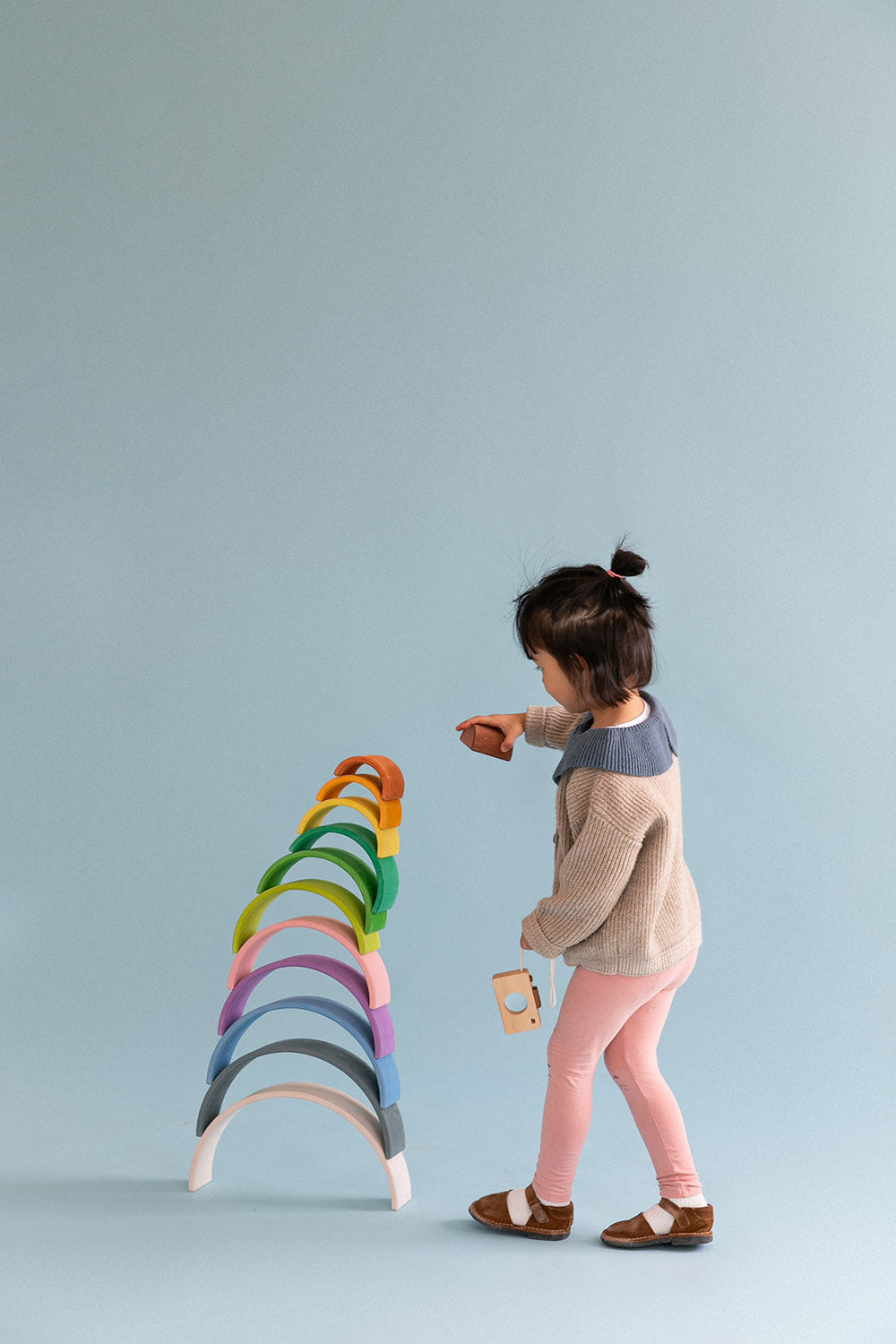 The Four Seasons Rainbow Stacker is a new take on our classic design, featuring a unique color palette inspired by the changing seasons. This version brings a fresh perspective to open-ended play while maintaining the same timeless quality.