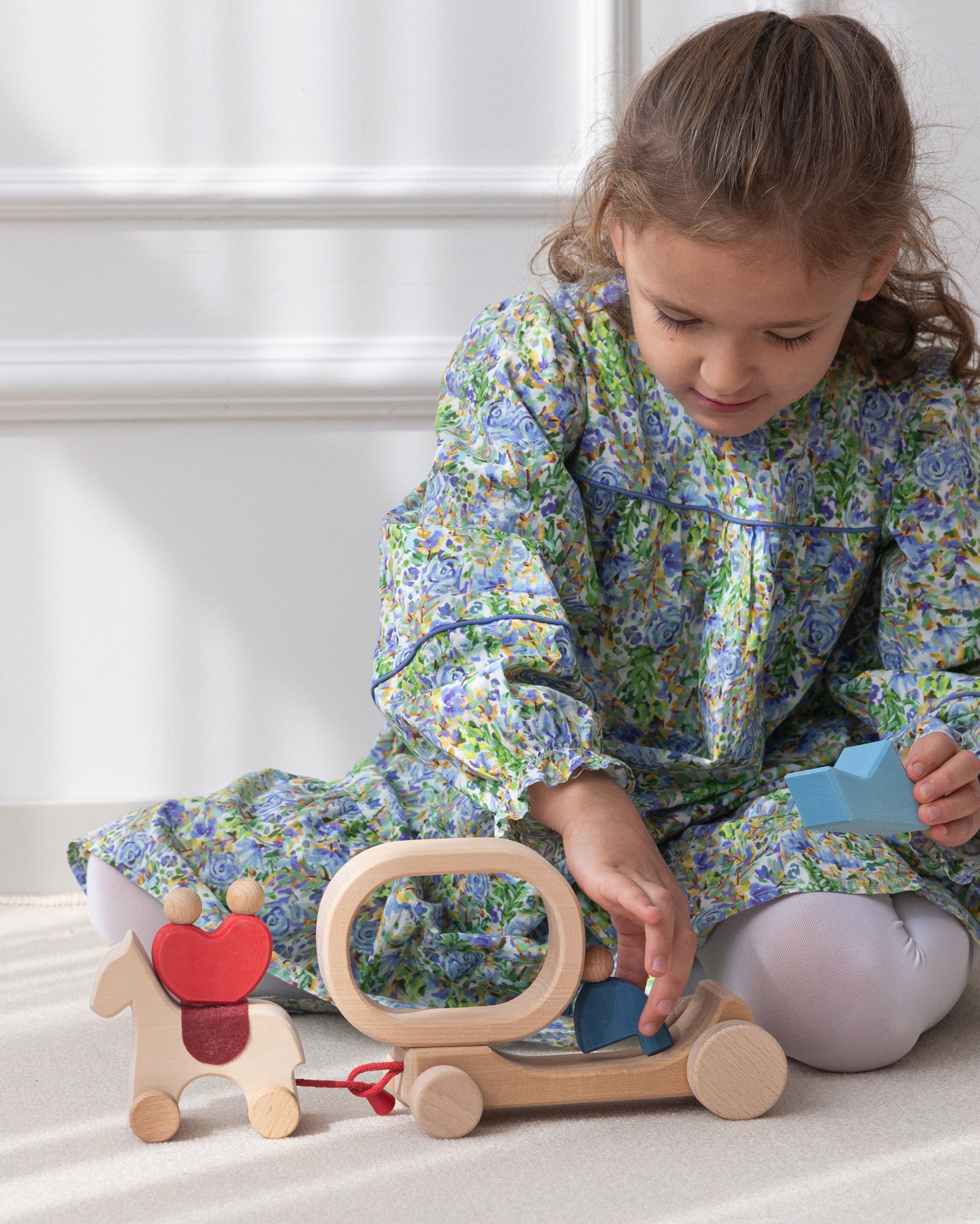 Designed as a wooden puzzle, Horse and Carriage consists of 6 pieces: the carriage base, a large oval frame, a crown, a mother and child figure, a horse, and a coachman. Each element can be detached and rearrange or mixed with other sets to spark endless stories. Both the horse and the carriage have wheels, so your child can easily pull them along. The horse even features a soft felt saddle, adding a gentle sensory element that enhances tactile play.
