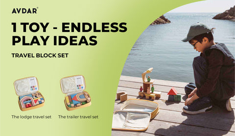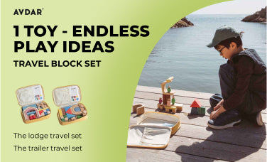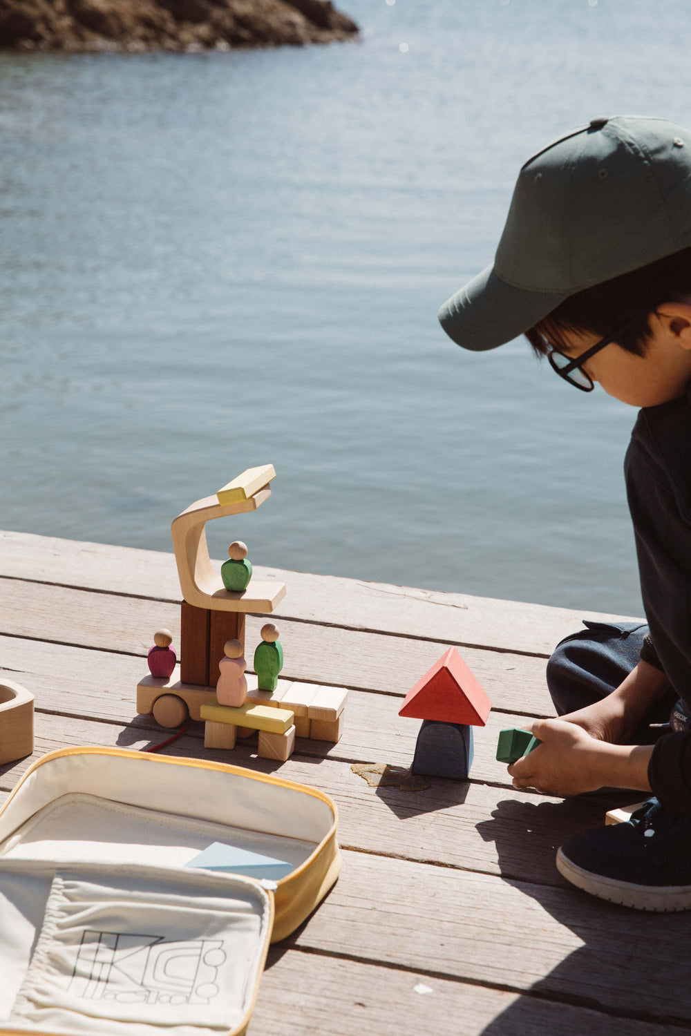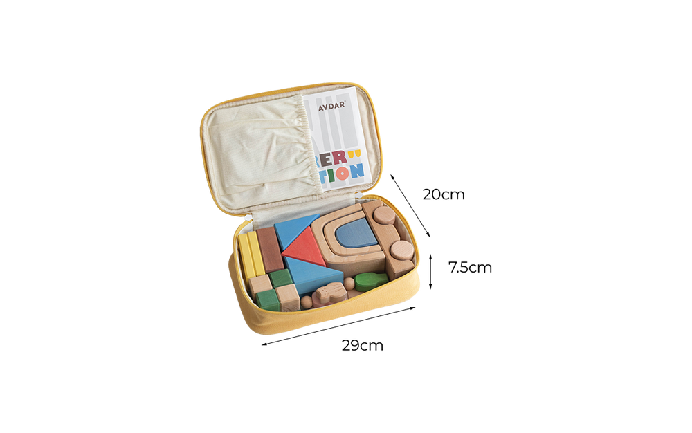 We designed this set to be portable, making it easy to take on the go, while also keeping children engaged with open-ended play. In addition to the wooden blocks, the toy also comes with a creative activity pack, all packed in a cotton bag.
