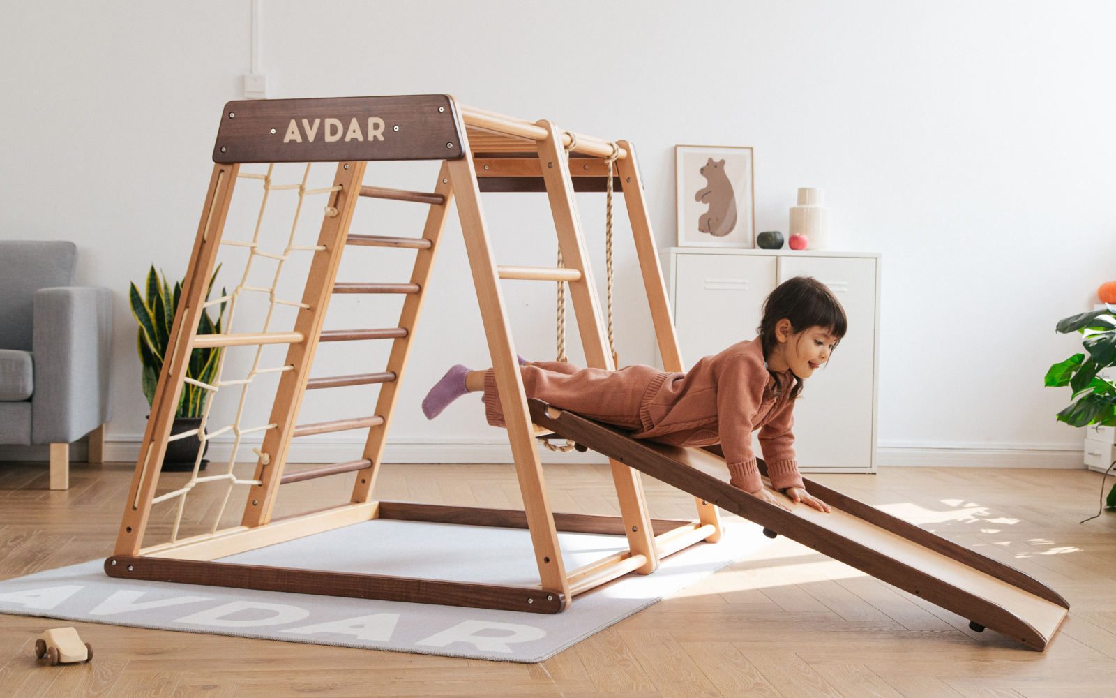 AVDAR Walnut Trapets Set is made with luxury Black Walnut and Beechwood. It was designed for your little ones that are eager to climb, explore and learn about their surrounding environment safely. The compact yet spacious design of the gym allows for physical and emotional development for young children while just playing.