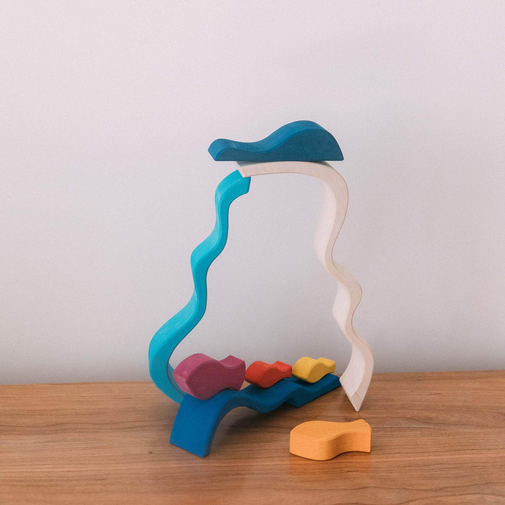 The Wave Block includes 4 waves and 4 fish of different sizes and colors. Smooth, grippy, and lightweight, these pieces are perfect for pretend play from an early age.